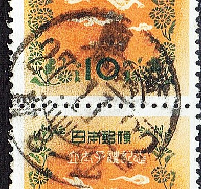 今回の台切手は1952年発行の明仁立太子礼10円のペアで、発行枚数は500万枚です。当時の記念切手の発行枚数はハガキ・封書額面切手で300~500万枚程度で決して多くはなく、この時代の記念切手の満月印は稀少な消印です。封書額面10円のペアですので、2倍重量便(当時は封書20グラムまで10円で20グラム超毎に10円加算でした)でも消印ではないかと思われます。前橋局県庁内分室のD欄分室名入り櫛型印では切手発行月印です。